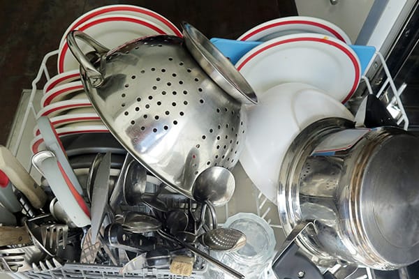 To avoid clanking in the dishwasher, make sure to arrange your dishes so they have a bit of breathing room. Place larger pots and pans strategically in the center to prevent them from whipping around when water is spraying, and try pointing all items downward for reduced sound levels.